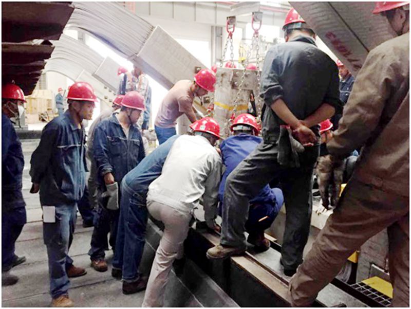 上午9時(shí)整,隨著分公司生產(chǎn)技術(shù)部副主任王立平同志一聲令下,現(xiàn)場(chǎng)實(shí)操演練正式開始。在生產(chǎn)廠家指導(dǎo)下,電解一車間、電解二車間、檢修車間積極行動(dòng),各負(fù)其責(zé),通力配合。9時(shí)5分,工藝車隊(duì)托運(yùn)進(jìn)電端應(yīng)急短路母線進(jìn)入三通道,各車間人員按照指揮拆卸托運(yùn)小車緊固螺栓,拆除301#槽3#、4#立柱母線風(fēng)格網(wǎng),天車配合吊裝短路母線就位,電解、檢修人員緊密配合,對(duì)工位、安裝卡具、緊固卡具螺栓。9時(shí)25分,進(jìn)電端短路母線下部安裝完成。按照應(yīng)急母線操作規(guī)程,9時(shí)40分,當(dāng)進(jìn)電端短路母線上部安裝完成時(shí),整套進(jìn)電端短路母線已全部安裝到位。