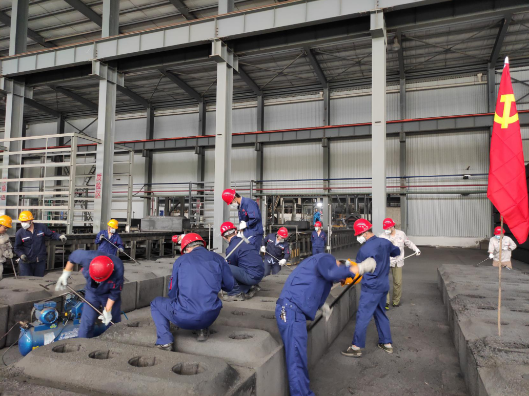 為充分發(fā)揮黨員先鋒模范作用,弘揚奉獻(xiàn)精神,近日,陽極分公司為解決焙燒陽極熟塊填充料粘結(jié)嚴(yán)重、外觀清理速度慢、影響生產(chǎn)進(jìn)度的問題,陽極分公司黨總支結(jié)合生產(chǎn)實際,組織開展了陽極熟塊清焦義務(wù)勞動主題黨日活動;顒幼詮7月21日至24日歷時四天,共計102名黨員干部、管理人員參與了此次活動。 活動中,各支部黨員職工積極踴躍、爭先恐后,按照分工任務(wù)計劃和清焦要求,大家分工協(xié)作、相互配合,對陽極熟塊表面粘接的焦粒及炭碗進(jìn)行了清理,勞動現(xiàn)場熱火朝天,一片繁忙。經(jīng)過四天的奮戰(zhàn),共清理陽極熟塊208塊,極大的緩解了焙燒塊清焦難題,有效保障焙燒車間生產(chǎn)速度和任務(wù)量。 通過此次活動的開展,充分發(fā)揮了廣大黨員勇于擔(dān)當(dāng)、甘于奉獻(xiàn)的精神,進(jìn)一步增強(qiáng)了黨組織的凝聚力和戰(zhàn)斗力,展示了陽極分公司黨員職工團(tuán)結(jié)一致的良好風(fēng)貌。 |