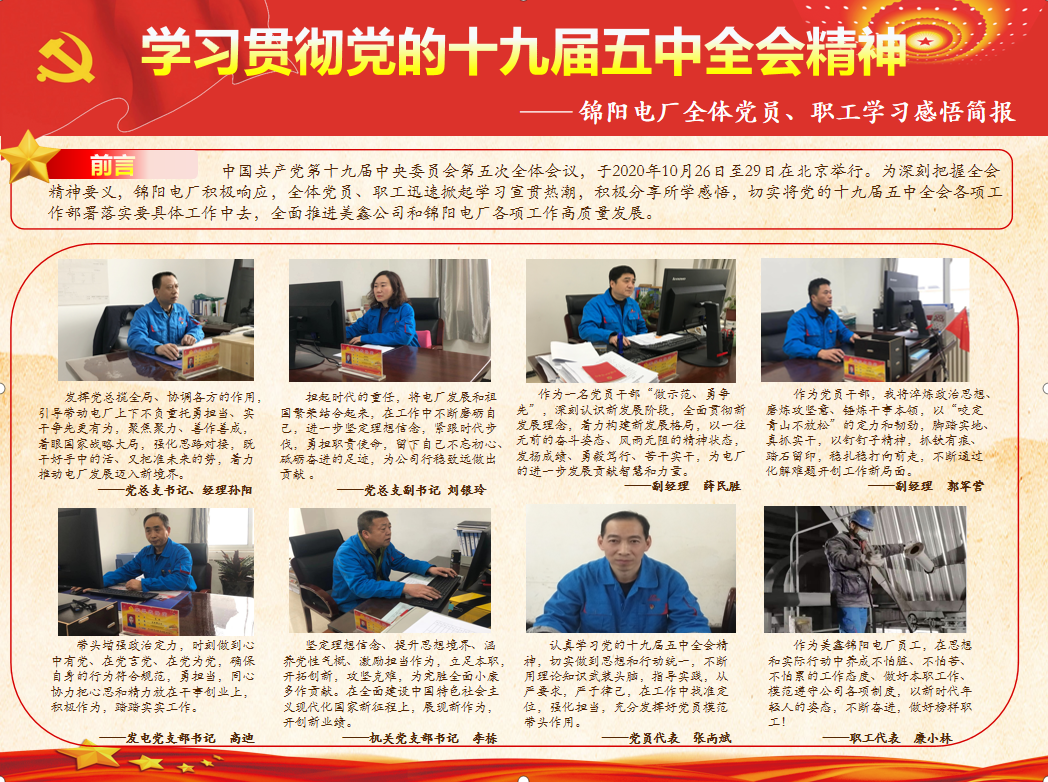 為深入學(xué)習(xí)宣傳貫徹黨的十九屆五中全會精神,指導(dǎo)推動各級黨組織迅速掀起學(xué)習(xí)宣傳貫徹全會精神的熱潮,根據(jù)省國資委黨委、集團(tuán)公司黨委和公司黨委的安排部署,陜西美鑫公司在理論中心組學(xué)習(xí)的基礎(chǔ)上,結(jié)合生產(chǎn)工作實(shí)際,精心安排,領(lǐng)導(dǎo)干部率先垂范,圍繞抓基層黨支部建設(shè)聯(lián)系點(diǎn)活動,自11月25日,成立由公司班子成員組成的學(xué)習(xí)貫徹黨的十九屆五中全會精神宣講團(tuán),有重點(diǎn)的深入基層一線黨支部,結(jié)合《黨的十九屆五中全會精神宣講提綱》內(nèi)容進(jìn)行宣講,在全公司營造了良好的學(xué)習(xí)宣傳貫徹全會精神的濃厚氛圍。 強(qiáng)化政治責(zé)任,不斷增強(qiáng)職工凝聚力 “堅持黨的全面領(lǐng)導(dǎo),堅持以人民為中心,堅持新發(fā)展理念,堅持深化改革開放,堅持系統(tǒng)觀念。”“疫情的沖擊是一時的、總體上是可控的,外部沖擊倒逼我們加快了自主創(chuàng)新步伐,我國經(jīng)濟(jì)長期向好的基本面沒有改變!薄 9名宣講團(tuán)成員分赴各基層單位,重點(diǎn)從深刻認(rèn)識我國進(jìn)入新發(fā)展階段的重大意義、有利條件和重要特征;準(zhǔn)確把握2035年遠(yuǎn)景目標(biāo)和“十四五”時期我國發(fā)展的指導(dǎo)方針、主要目標(biāo)、重點(diǎn)任務(wù);牢牢把握構(gòu)建新發(fā)展格局的戰(zhàn)略構(gòu)想和重要著力點(diǎn);堅持黨的全面領(lǐng)導(dǎo),動員各方面力量為實(shí)現(xiàn)“十四五”規(guī)劃和2035年遠(yuǎn)景目標(biāo)而團(tuán)結(jié)奮斗四個方面出發(fā)進(jìn)行宣講。引導(dǎo)廣大職工自覺把思想認(rèn)識統(tǒng)一到黨中央和習(xí)總書記的決策部署上來,深刻認(rèn)識全會核心要義,用全會精神武裝頭腦。 宣講會上,廣大職工聚精會神聆聽,全神貫注領(lǐng)會。各基層黨組織根據(jù)宣講學(xué)習(xí)內(nèi)容展開熱烈討論,談思想認(rèn)識、講學(xué)習(xí)體會、把工作作風(fēng)、定工作基調(diào)。通過交流,廣大職工對“十四五”規(guī)劃相關(guān)內(nèi)容有了更充分的認(rèn)識、更深刻的理解,切實(shí)將智慧和力量凝聚到落實(shí)全會精神的各項目標(biāo)任務(wù)上來。 全面準(zhǔn)確解讀,把握核心要義和重點(diǎn)內(nèi)容 “要加快科技自立自強(qiáng)。這是確保國內(nèi)大循環(huán)暢通、塑造我國在國際大循環(huán)中新優(yōu)勢的關(guān)鍵。要增強(qiáng)責(zé)任感和危機(jī)感,丟掉幻想,正視現(xiàn)實(shí),打好關(guān)鍵核心技術(shù)攻堅戰(zhàn),加快攻克重要領(lǐng)域“卡脖子”技術(shù)!薄皥猿謱(shí)施更大范圍、更寬領(lǐng)域、更深層次對外開放,依托我國大市場優(yōu)勢,促進(jìn)國際合作,實(shí)現(xiàn)互利共贏”…… 宣講輔導(dǎo)中,宣講團(tuán)成員主要圍繞廣大職工普遍關(guān)心的問題、公司發(fā)展密切相關(guān)問題進(jìn)行重點(diǎn)講解,深入淺出、重點(diǎn)突出,不僅從理論層面深度解讀,更是結(jié)合公司發(fā)展實(shí)際,深刻闡明今后一個時期我國發(fā)展的指導(dǎo)方針、目標(biāo)任務(wù)、戰(zhàn)略舉措,并對黨中央關(guān)于當(dāng)前形勢的重大判斷和關(guān)于推動高質(zhì)量發(fā)展、構(gòu)建新發(fā)展格局等重大部署作了深入解讀,幫助廣大職工進(jìn)一步加深對五中全會精神實(shí)質(zhì)、精髓要義、政策措施的認(rèn)識。 “宣講團(tuán)成員的宣講輔導(dǎo)生動深刻,對我們學(xué)習(xí)貫徹全會精神起到有力推動作用。”“宣講報告內(nèi)涵豐富、講解透徹,聯(lián)系實(shí)際、回應(yīng)關(guān)切,很及時、很解渴,能幫助我們?nèi)、深入、系統(tǒng)、準(zhǔn)確地理解把握全會精神。”聽完宣講后,有的參會代表說到。 提高宣講實(shí)效,多措并舉推動全會精神落地生根 “要切實(shí)增強(qiáng)緊迫感,繼續(xù)以時不我待、只爭朝夕的精神,全力以赴投身各項工作。”“要堅持始終把嚴(yán)抓安全生產(chǎn)放在突出重要的位置,要進(jìn)一步強(qiáng)化干部隊伍作風(fēng)建設(shè)工作,營造風(fēng)清氣正的干事創(chuàng)業(yè)發(fā)展環(huán)境!薄 在公司宣講團(tuán)示范下,各基層單位多措并舉提高宣講實(shí)效:錦陽電廠黨總支通過動員部署、理論宣講、創(chuàng)辦感悟簡報等形式,指導(dǎo)職工認(rèn)真學(xué)習(xí)領(lǐng)會貫徹五中全會精神;陽極分公司黨總支成立宣講工作組,深入車間、班組一線,推動學(xué)習(xí)貫徹五中全會精神向一線延伸拓展……一場場形式多樣、具體務(wù)實(shí)的宣講活動,持續(xù)推動全會精神進(jìn)入思想進(jìn)入一線。 各基層單位緊密結(jié)合公司和本單位實(shí)際,切實(shí)把學(xué)習(xí)貫徹全會精神與實(shí)現(xiàn)公司年度各項工作目標(biāo)任務(wù)結(jié)合起來,與提升企業(yè)經(jīng)營管理水平結(jié)合起來,與強(qiáng)化安全管理,打贏“百日安全”攻堅戰(zhàn)結(jié)合起來,在統(tǒng)籌抓好常態(tài)化疫情防控和安全穩(wěn)定工作的基礎(chǔ)上,堅持“目標(biāo)不變、任務(wù)不減、標(biāo)準(zhǔn)不降、干勁不松”,全面完成年度各項工作。 隨著宣講活動深入開展,一股學(xué)習(xí)宣傳貫徹全會精神的旋風(fēng)已經(jīng)掀起,廣大職工也備受