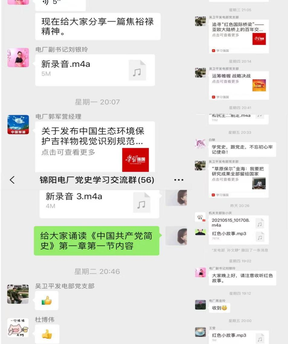 為強(qiáng)化學(xué)習(xí)交流,讓全體黨員職工參與到黨史學(xué)習(xí)中來,特創(chuàng)立錦陽電廠黨史學(xué)習(xí)交流群,通過黨史學(xué)習(xí)交流群以及工會(huì)“1+X+100”工作群,要求大家以“今天我是誦讀人”的新形式,按序每日誦讀原著、講紅色故事,并錄制音頻于群內(nèi)分享;顒(dòng)開始后,大家積極響應(yīng),相繼對(duì)《論中國(guó)共產(chǎn)黨歷史》、《毛澤東、鄧小平、江澤民、胡錦濤關(guān)于中國(guó)共產(chǎn)黨歷史論述摘編》、《習(xí)近平新時(shí)代中國(guó)特色社會(huì)主義思想學(xué)習(xí)問答》、《中國(guó)共產(chǎn)黨簡(jiǎn)史》、紅色故事、革命先烈先進(jìn)事跡等學(xué)習(xí)音頻進(jìn)行微分享,大大提高了黨史學(xué)習(xí)教育的吸引力、互動(dòng)性和感染力。截止63日,分享誦讀音頻共計(jì)58篇。