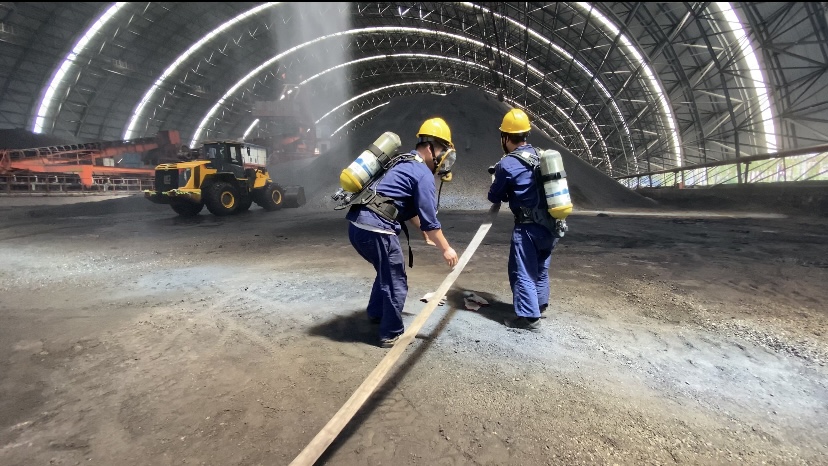 本次演練,燃運(yùn)部結(jié)合生產(chǎn)現(xiàn)場(chǎng)實(shí)際情況,參考大量事故案例,系統(tǒng)分析了燃運(yùn)部現(xiàn)階段潛在的風(fēng)險(xiǎn)隱患和事故應(yīng)急能力,模擬制定干煤棚存煤自燃火災(zāi)事故應(yīng)急演練預(yù)案。火災(zāi)發(fā)生后,現(xiàn)場(chǎng)巡檢人員發(fā)現(xiàn)火情后立即匯報(bào)當(dāng)班班長(zhǎng),班長(zhǎng)匯報(bào)部門(mén)值班領(lǐng)導(dǎo),部門(mén)接到火警后,立即啟動(dòng)消防應(yīng)急預(yù)案。演練現(xiàn)場(chǎng)多專(zhuān)業(yè)聯(lián)合處置,利用消防水炮、消防栓及車(chē)輛高壓沖洗水炮對(duì)前期明火進(jìn)行消除,防止事故擴(kuò)大。裝載機(jī)密切配合,將部分燃煤鏟運(yùn)至空曠區(qū)域,防止二次復(fù)燃。
