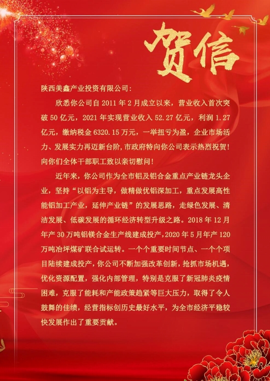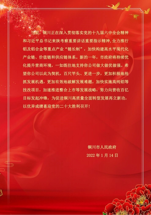 今年,在公司全體職工的共同努力下,公司上下克服重重困難,銳意進取、努力奮進,圓滿完成全年目標(biāo)任務(wù),對銅川循環(huán)經(jīng)濟產(chǎn)業(yè)發(fā)展做出了自己的貢獻。銅川市政府專門發(fā)來賀信,并給予我公司“不斷加強改革創(chuàng)新,搶抓市場機遇,優(yōu)化資源配置,強化內(nèi)部管理,特別是克服了新冠肺炎疫情困難,克服了能耗和產(chǎn)能政策趨緊等巨大壓力,取得了令人鼓舞的佳績”的高度評價,F(xiàn)將《賀信》全文刊登,供大家認真學(xué)習(xí),提振士氣,以更加飽滿的熱情投入工作。