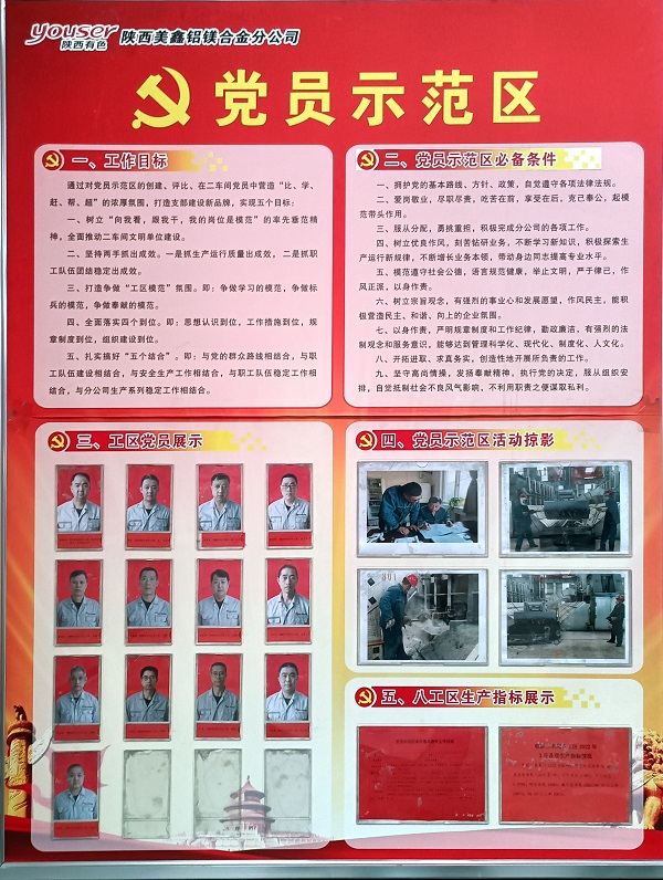 2022年,鋁鎂合金分公司黨委經(jīng)過考察、驗(yàn)收和評定,授予電解二車間八工區(qū)“黨員工藝創(chuàng)新示范區(qū)”,13名黨員干部充分發(fā)揮黨建引領(lǐng)作用,主動作為,確保車間生產(chǎn)穩(wěn)步推進(jìn),為其它工區(qū)做出了良好表率,以自己的實(shí)際行動體現(xiàn)“黨員示范區(qū)”的先進(jìn)性。 電解二車間黨支部對八工區(qū)安全環(huán)保及作業(yè)質(zhì)量進(jìn)行具體的細(xì)化和要求,制定重點(diǎn)提升工作目標(biāo)要求,在勞保穿戴、換極、維極,撈取炭渣、出鋁精準(zhǔn)度等生產(chǎn)環(huán)節(jié),設(shè)立重點(diǎn)提升工作目標(biāo)檢查人、責(zé)任人。黨員干部積極發(fā)揮先鋒模范帶頭作用,嚴(yán)格落實(shí)工藝技術(shù)調(diào)整及現(xiàn)場管理,實(shí)施規(guī)范化操作和精細(xì)化操作,通過關(guān)鍵作業(yè)、突發(fā)事件現(xiàn)場處理,及時發(fā)現(xiàn)并提出糾正措施,確保執(zhí)行及時有效。“這張閃亮的‘黨員工藝創(chuàng)新示范崗’標(biāo)牌,既是一份榮譽(yù)又是一種責(zé)任,激勵著我們不忘初心、砥礪前行,全力投入到工藝創(chuàng)新和技術(shù)改造中來,為分公司提質(zhì)增效貢獻(xiàn)電解力量!彪娊舛囬g黨支部書記、主任靳祥印說道。 |